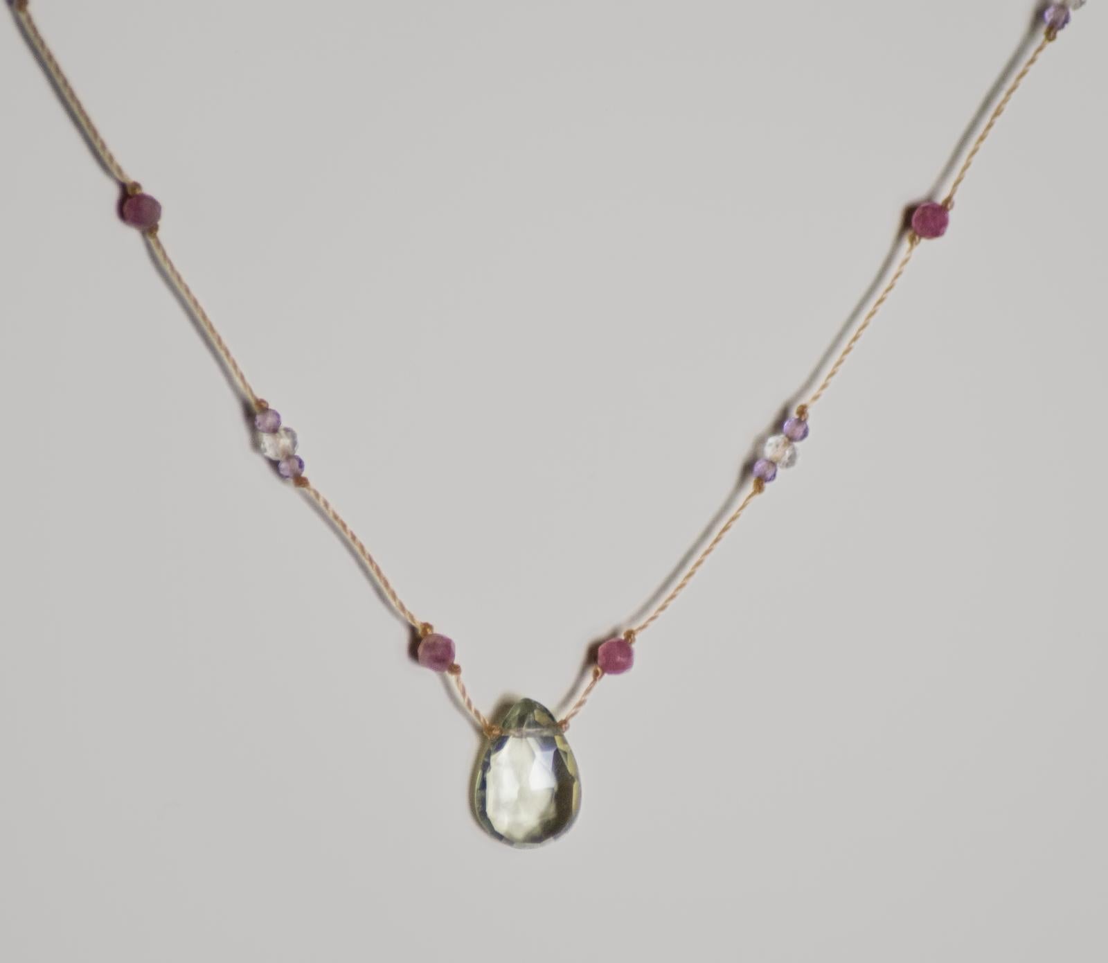 Gulab Valley Drop Necklace - Romantic Pink Beaded Necklace with Clear/Green Hue Pendant